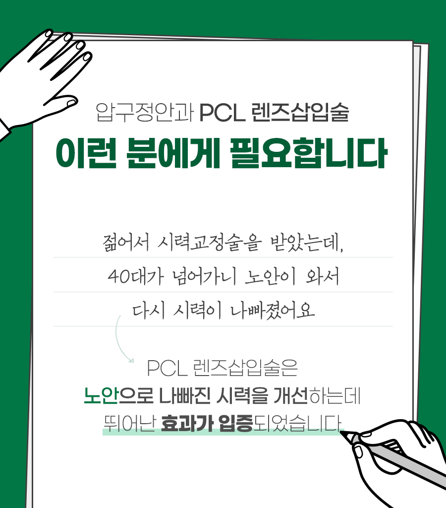 노안이 심해지면 안과적 치료를 고려할 수 있어요. 최근에는 PCL 렌즈 수술과 같은 방법이 많이 발전했어요. 이 수술은 노안으로 인해 시력이 저하된 분들에게 효과적이라고 알려져 있죠. 수술을 통해 시력을 개선할 수 있는 방법도 있으니, 전문가와 상담해보는 것이 좋습니다.